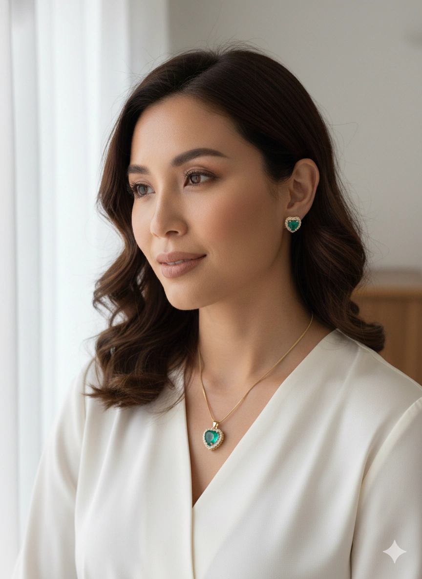 O verde esmeralda é a cor da prosperidade, renovação e elegância. Usar este conjunto não é apenas um toque de beleza, mas um amuleto que atrai sorte e sofisticação.